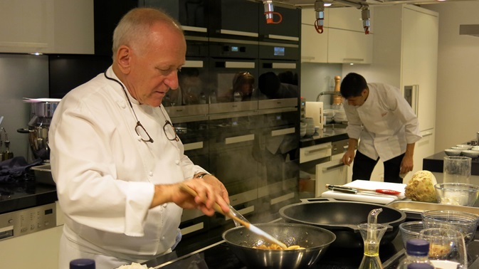Durante el encuentro en las cocinas activas del showroom, Carles Gaig enseñó a sus alumnos cómo cocinar algunos de sus platos más representativos. Así, los asistentes descubrieron los secretos para cocinar un suculento canelón de trufa de verano, una sabrosa fideuà con sepia y alioli o un “wok” de calamares con cebolla caramelizada. Para cocinar cada uno de estos platos, el chef se ayudó de los electrodomésticos Miele, como sus hornos de última generación o las placas de inducción más punteras que permiten la libre ubicación de los recipientes.