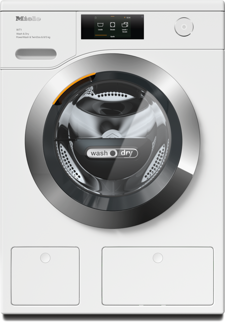 - 4.Durante la fase de desarrollo de la serie de lavasecadoras WT1, Miele ha testado varios modelos y componentes principales durante 5.000 lavados y 4.000 secados (= 5 lavados y 4 secados a la semana durante 50 semanas p.a.) en varios programas. Más información: miele.com/20years