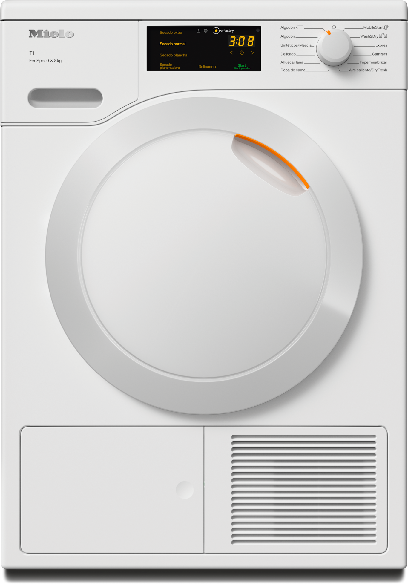 - 9.Ahorro de tiempo calculado en comparación con las secadoras Miele sin EcoSpeed con la misma carga y eficiencia energética similar. Comprobado en el programa «Algodón» con carga completa.
