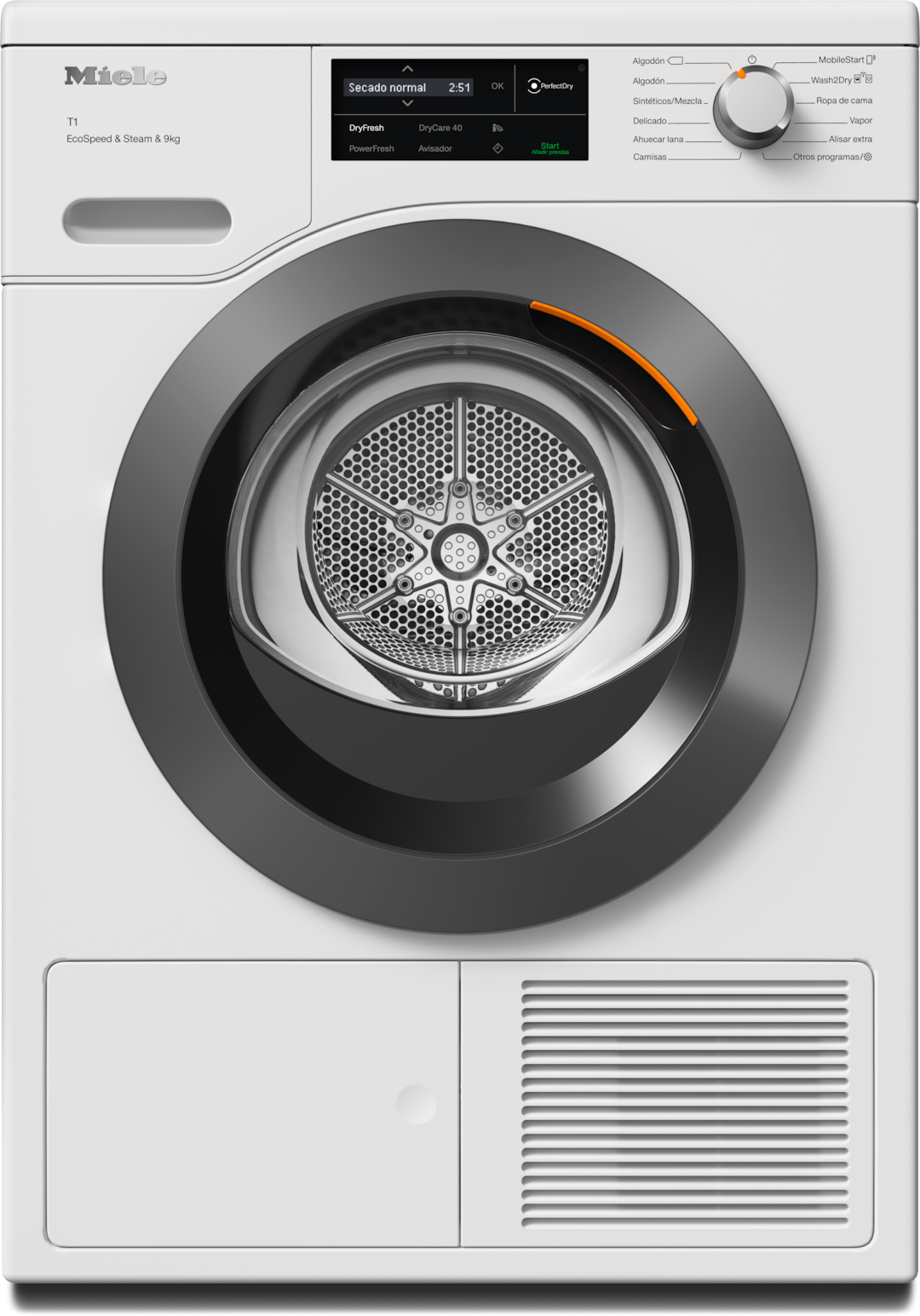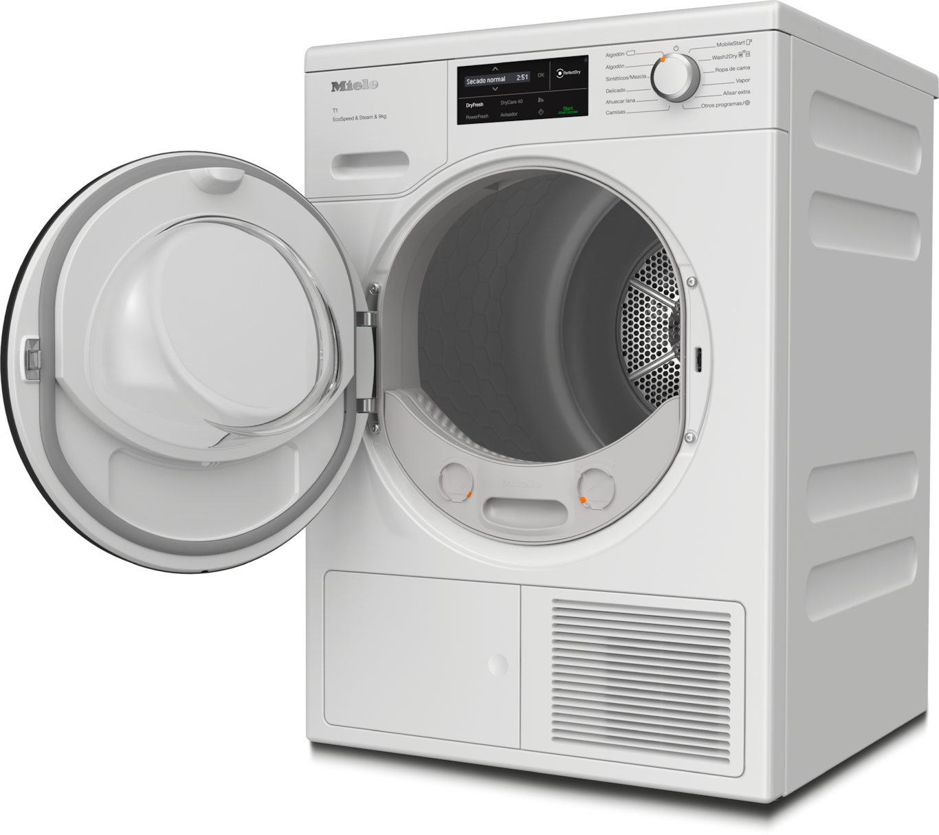 - 11.Ahorro de tiempo calculado en comparación con las secadoras Miele sin EcoSpeed con la misma carga y eficiencia energética similar. Comprobado en el programa «Algodón» con carga completa.